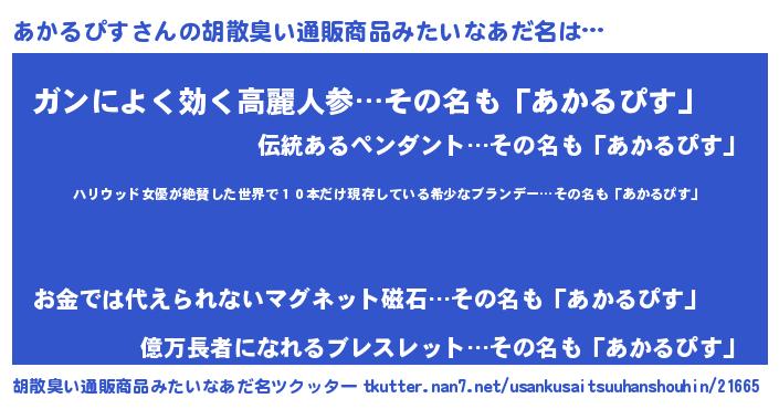 | 意味不明あだ名 | 『住所不定無職あかるぴす(79歳)』 |