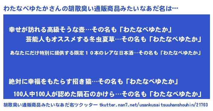 | 意味不明あだ名 | 『住所不定無職わたなべゆたか(47歳)』 |