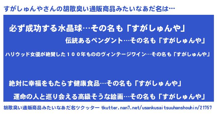| 意味不明あだ名 | 『住所不定無職すがしゅんや(11歳)』 |
