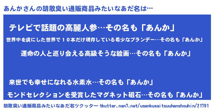 | 意味不明あだ名 | 『あんかフォーエバー』『自称あんか』 |