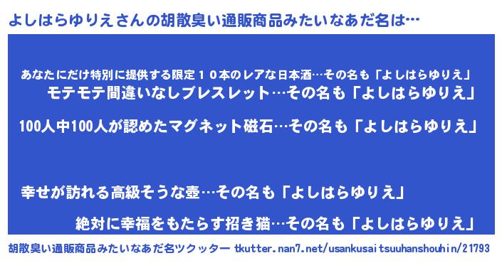 | ヘコむあだ名 | 『よしはらゆりえ(笑)』『よしもー』 |