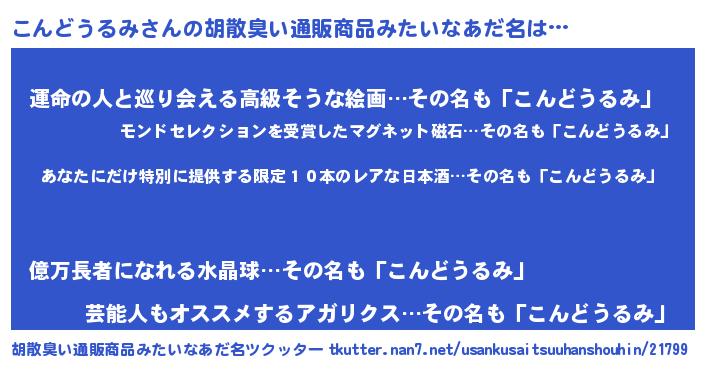 | 男性向けラノベタイトル風あだ名 | 『こんどうるみ~年齢イコール彼女いない歴の魔法使い~』 |