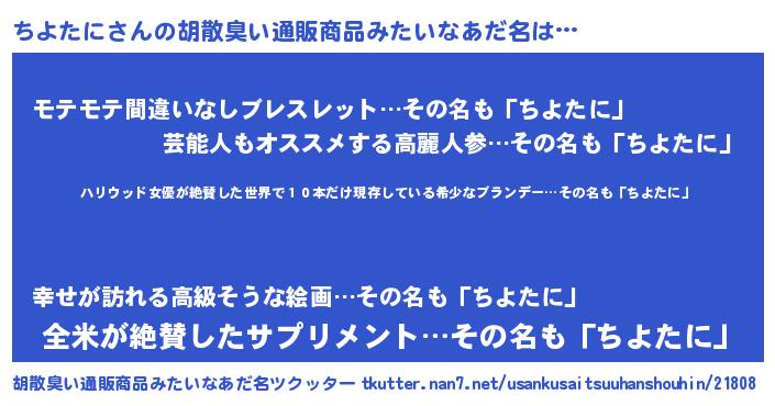 | 意味不明あだ名 | 『住所不定無職ちよたに(85歳)』 |