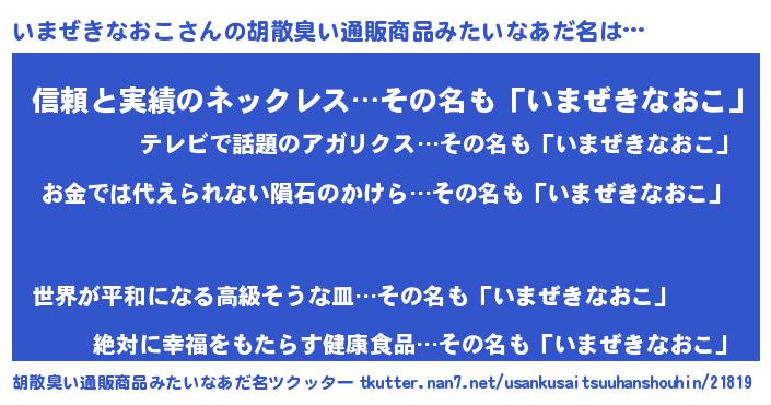 | 男性向けラノベタイトル風あだ名 | 『おまえをオタクにしてやるから、俺をいまぜきなおこにしてくれ! 』 |