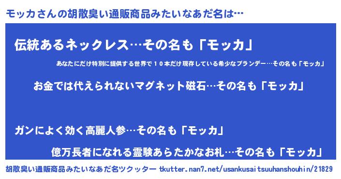 | 男性向けラノベタイトル風あだ名 | 『転生したらモッカだった件』 |