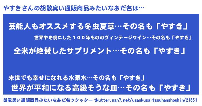 | 男性向けラノベタイトル風あだ名 | 『やすきに滅ぼされるだけの簡単なお仕事です』 |