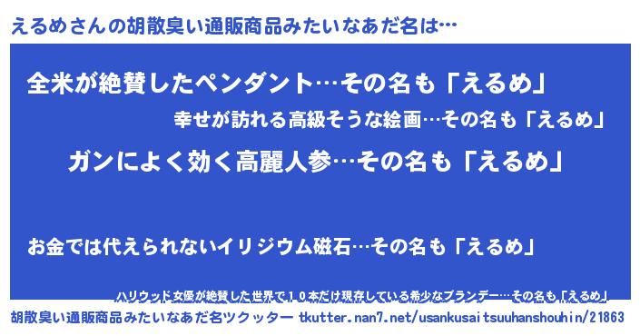 | 意味不明あだ名 | 『自称えるめ』『とにかく怪しいえるめ』 |