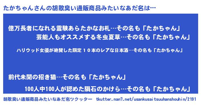 | 意味不明あだ名 | 『住所不定無職たかちゃん(53歳)』 |