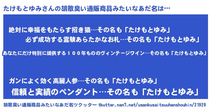 | 男性向けラノベタイトル風あだ名 | 『たけもとゆみ~年齢イコール彼女いない歴の魔法使い~』 |