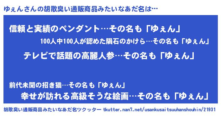 | 男性向けラノベタイトル風あだ名 | 『Re:ゆぇんから始める異世界生活』 |