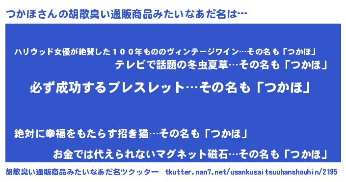 | 男性向けラノベタイトル風あだ名 | 『ツカホスレイヤー』『緋弾のツカホ』 |