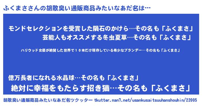 | ヘコむあだ名 | 『ふくまさ(苦笑)』『ふくもー』 |