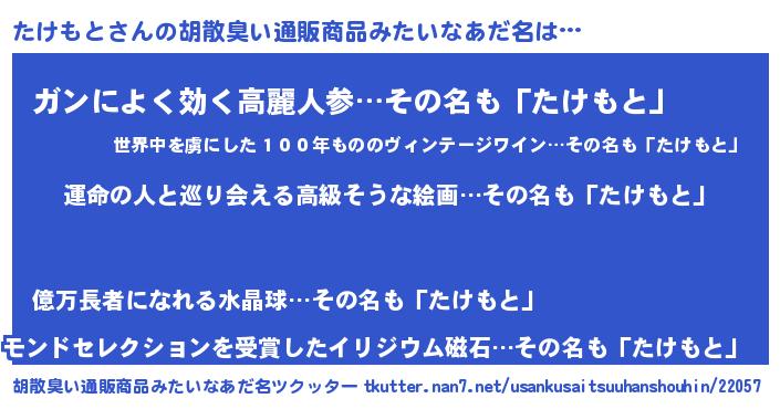 | 肩書あだ名 | 『たけもと総理大臣』『たけもと船長』 |
