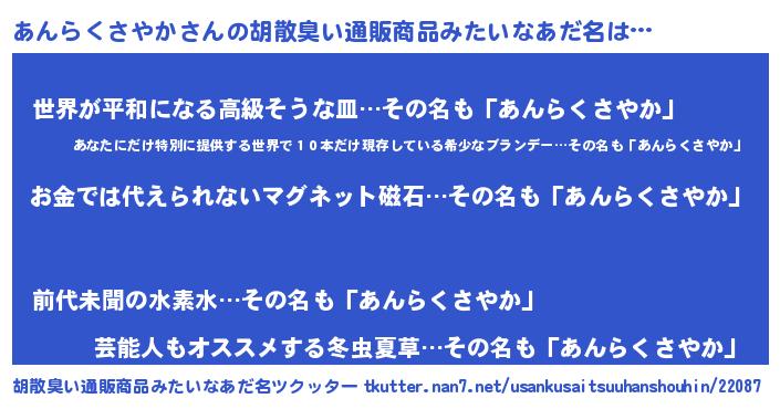 | 欧米人風あだ名 | 『アンジェラ・あんらくさやか』 |