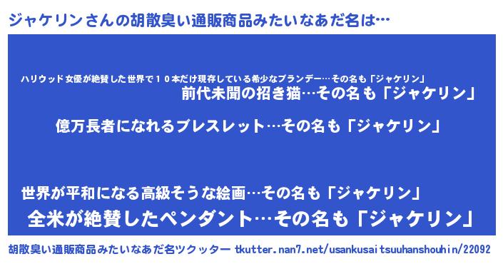 | 恥ずかしいあだ名 | 『プリティージャケリン』『ジャリンリン』 |