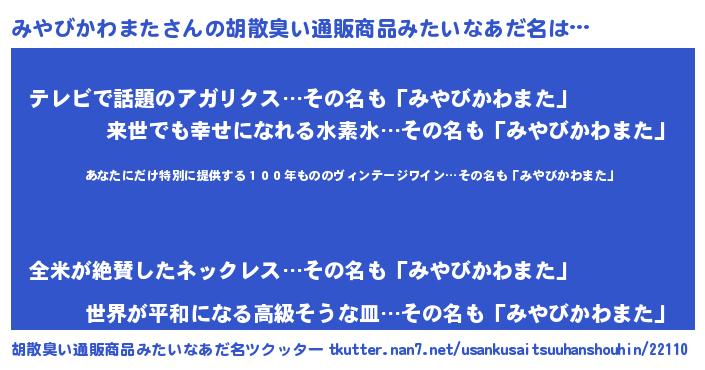 | 意味不明あだ名 | 『住所不定無職みやびかわまた(4歳)』 |