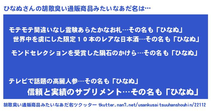 | 男性向けラノベタイトル風あだ名 | 『ノーゲーム・ノーヒナヌ』 |