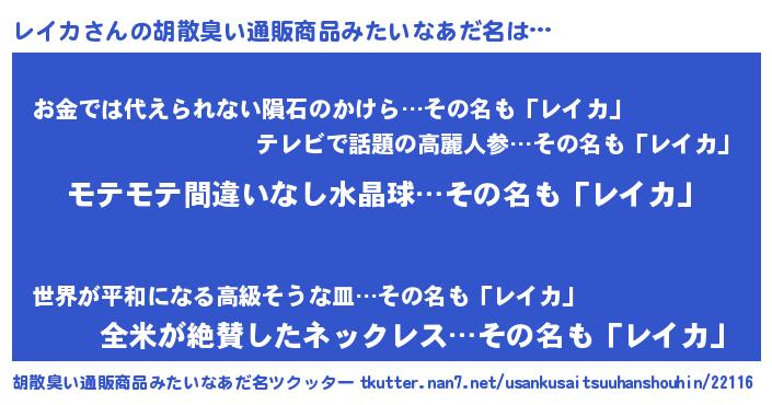 | 欧米人風あだ名 | 『トリンドルレイカ』『マイケルレイカ』 |