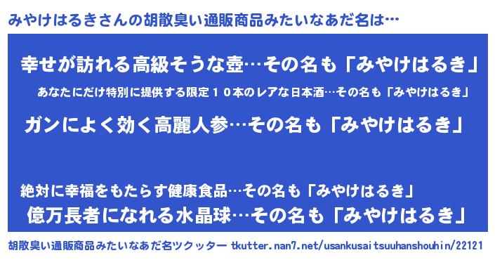| 肩書あだ名 | 『みやけはるき閣下』『みやけはるき艦長』 |