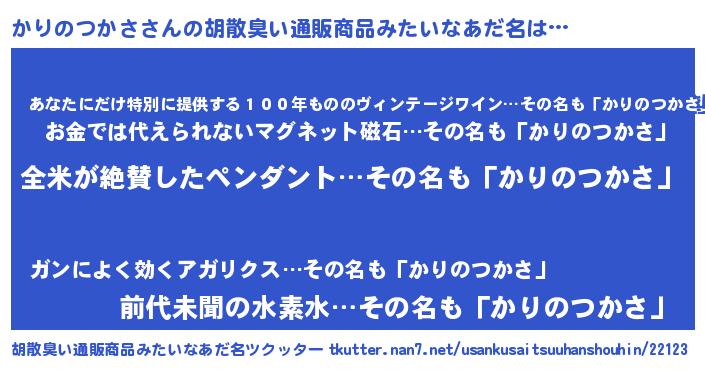 | ヘコむあだ名 | 『かりぷりん』『かりのつかさ(笑)』 |
