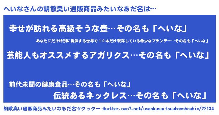 | 意味不明あだ名 | 『ニラ科へいな属』『自称へいな』 |