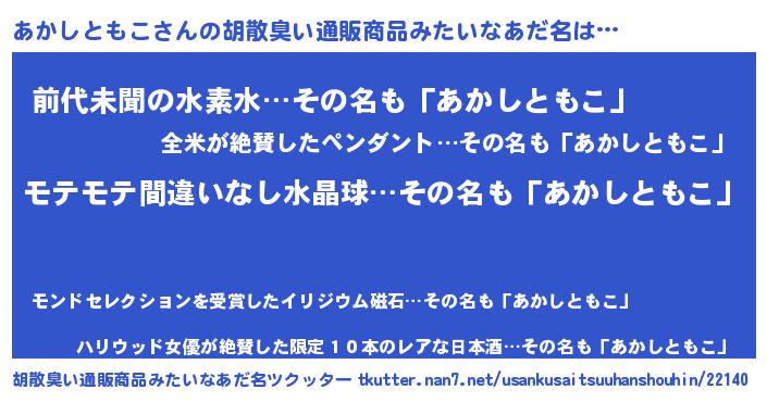 | ヘコむあだ名 | 『あかにゅー』『あかしともこ(震え声)』 |