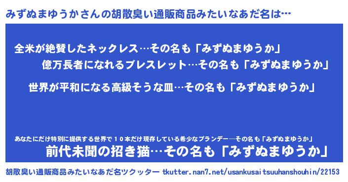みずぬまゆうかさんの胡散臭い通販商品みたいなあだ名をツクッター!