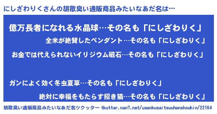 | 男性向けラノベタイトル風あだ名 | 『転生したらにしざわりくだった件』 |