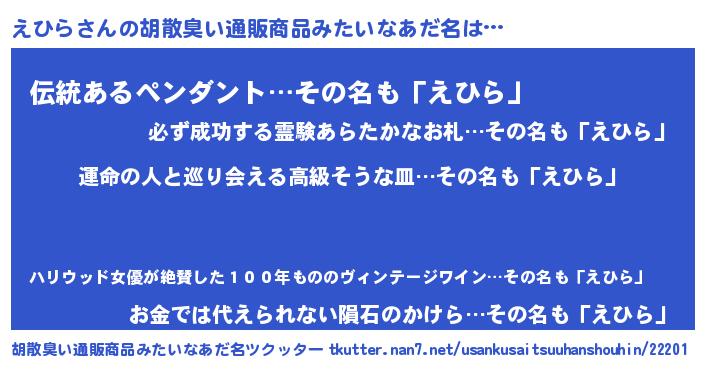 | 意味不明あだ名 | 『えひらフォーエバー』『ペロリンえひら』 |