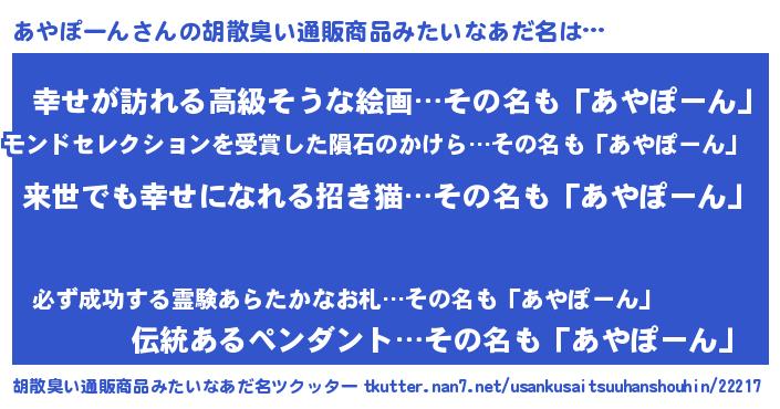 | 伝説のあだ名 | 『古より伝わる吟遊詩人あやぽーん』 |