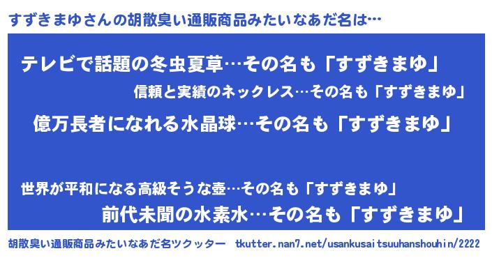 | ヘコむあだ名 | 『すずふぇ~』『すずきまゆ(震え声)』 |