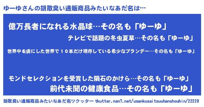 | 男性向けラノベタイトル風あだ名 | 『この素晴らしい世界にゆーゆを!』 |