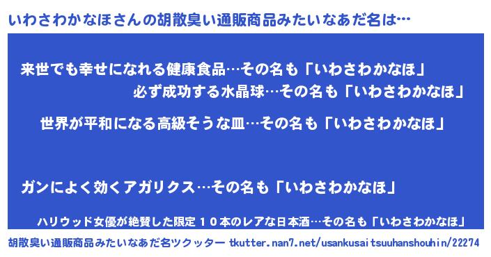 | 男性向けラノベタイトル風あだ名 | 『転生したらいわさわかなほだった件』 |