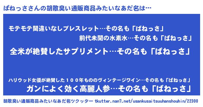 | 男性向けラノベタイトル風あだ名 | 『ばねっさの嫁は女の子じゃないと思った?』 |