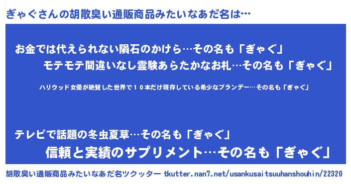 | 男性向けラノベタイトル風あだ名 | 『魔弾の王とぎゃぐ』『ぎゃぐの憂鬱』 |