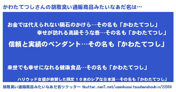 | 肩書あだ名 | 『かわたてつし塾長』『かわたてつし少尉』 |