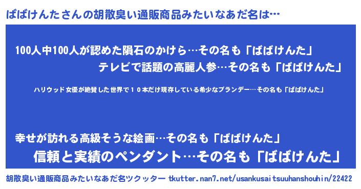 | 意味不明あだ名 | 『住所不定無職ばばけんた(95歳)』 |