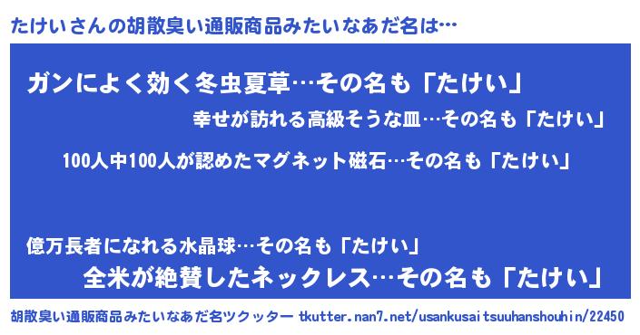 | ヘコむあだ名 | 『たけお』『豆乳』『たけにゅー』 |