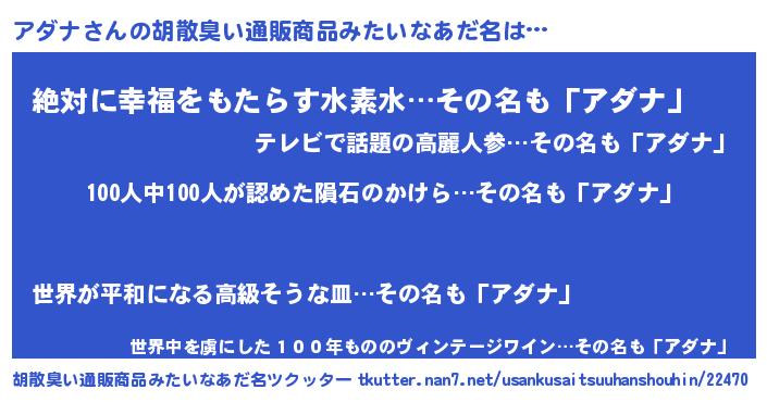 | 女子向けラノベタイトル風あだ名 | 『アダナ夫妻のなれそめ』『闇のアダナ』 |