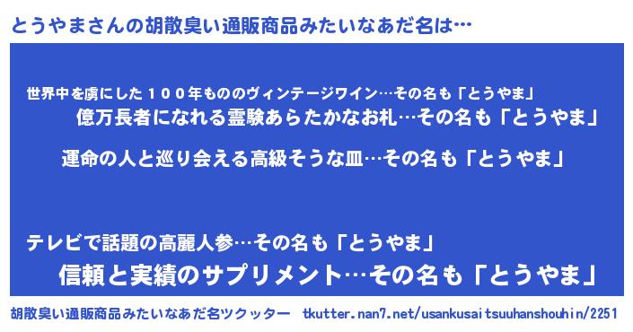 | ファンタジー風あだ名 | 『エターナルトウヤマー』『トウフェル』 |