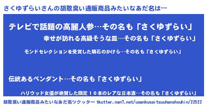 | 男性向けラノベタイトル風あだ名 | 『うちのさくゆずらいが世界を掌握している!』 |