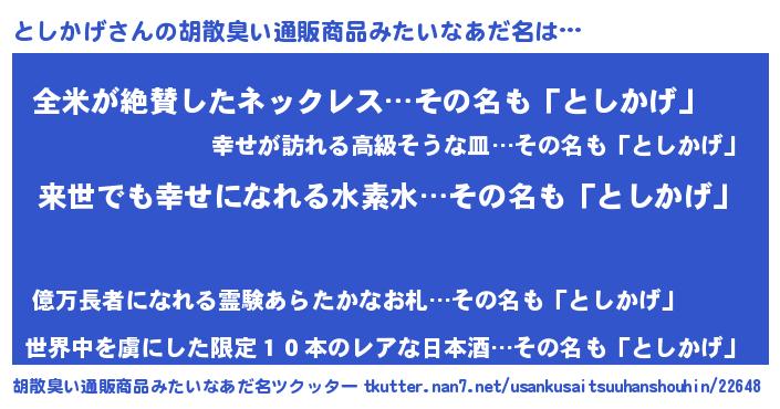 | ヘコむあだ名 | 『としかげ(震え声)』『としぷりん』 |