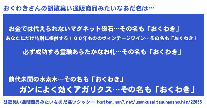 | 男性向けラノベタイトル風あだ名 | 『おくわきの憂鬱』『魔弾の王とおくわき』 |