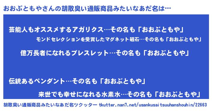 | 恥ずかしいあだ名 | 『プリティーおおぶともや』『おおちん』 |