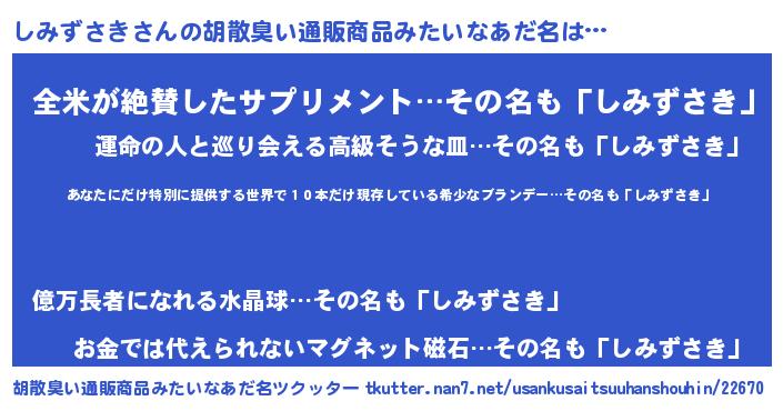 | 意味不明あだ名 | 『住所不定無職しみずさき(91歳)』 |