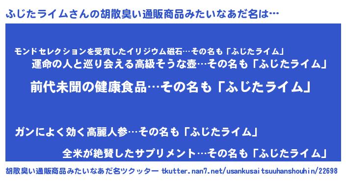 | 男性向けラノベタイトル風あだ名 | 『ふじたライム~年齢イコール彼女いない歴の魔法使い~』 |