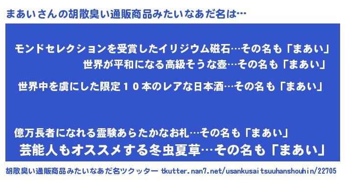 | 意味不明あだ名 | 『なめこ科まあい属』『自称まあい』 |