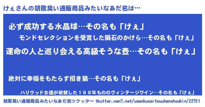 けぇさんの胡散臭い通販商品みたいなあだ名をツクッター!