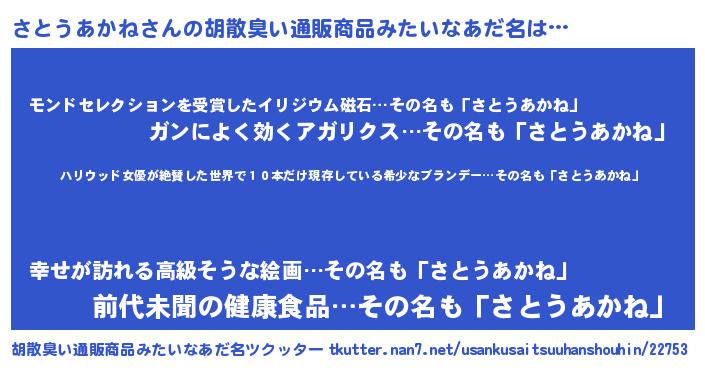 | 意味不明あだ名 | 『住所不定無職さとうあかね(71歳)』 |