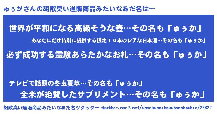 | 意味不明あだ名 | 『ペロリンゅぅか』『ゅぅかフォーエバー』 |